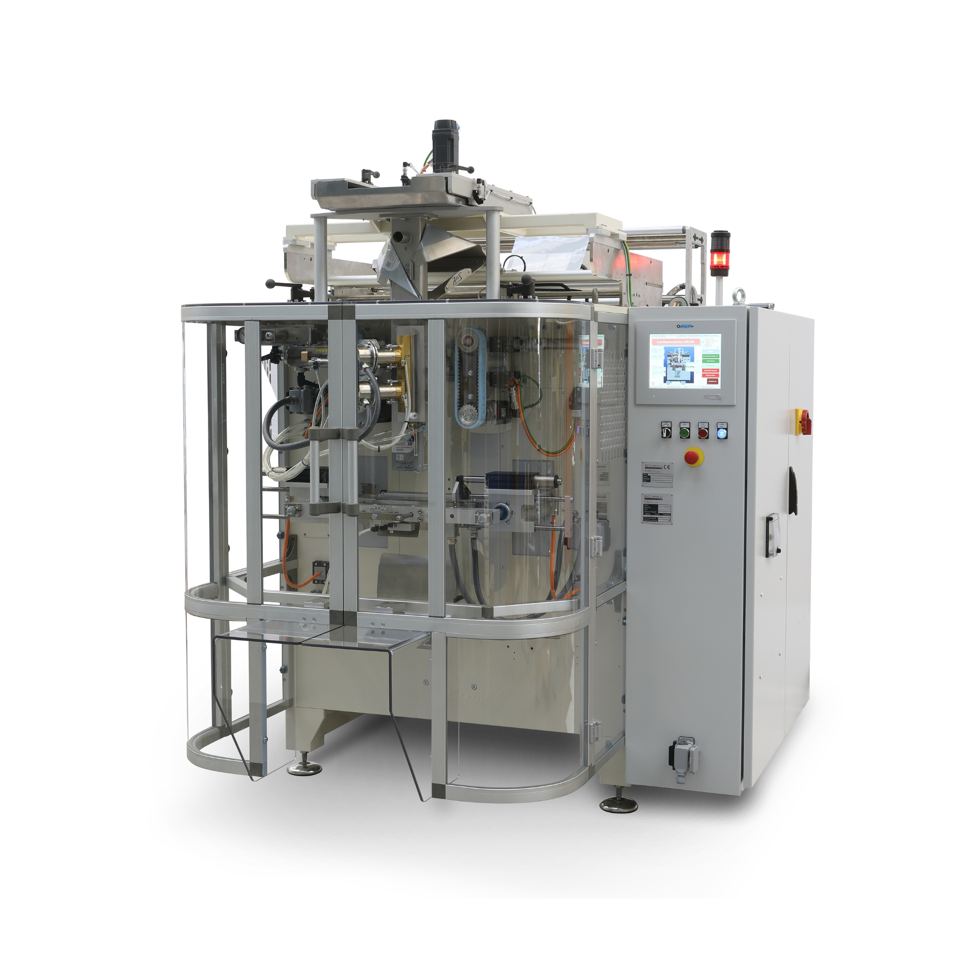 Vertical packer at high-speed continuous motion to produce bags formed from a reel of film. The sealing jaws and film feed powered by brushless motors. Main functions: