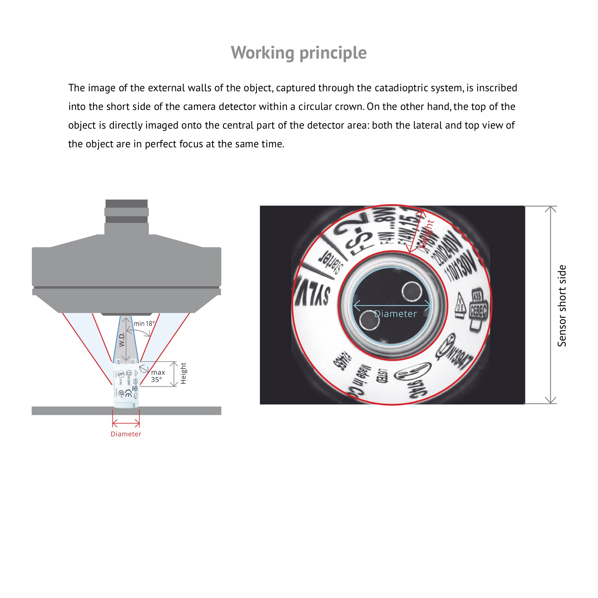The sides of the object are imaged through the catadioptric system, while the top surface is imaged directly onto the center of the sensor area, allowing for a complete and perfectly focused view of the inspected object.