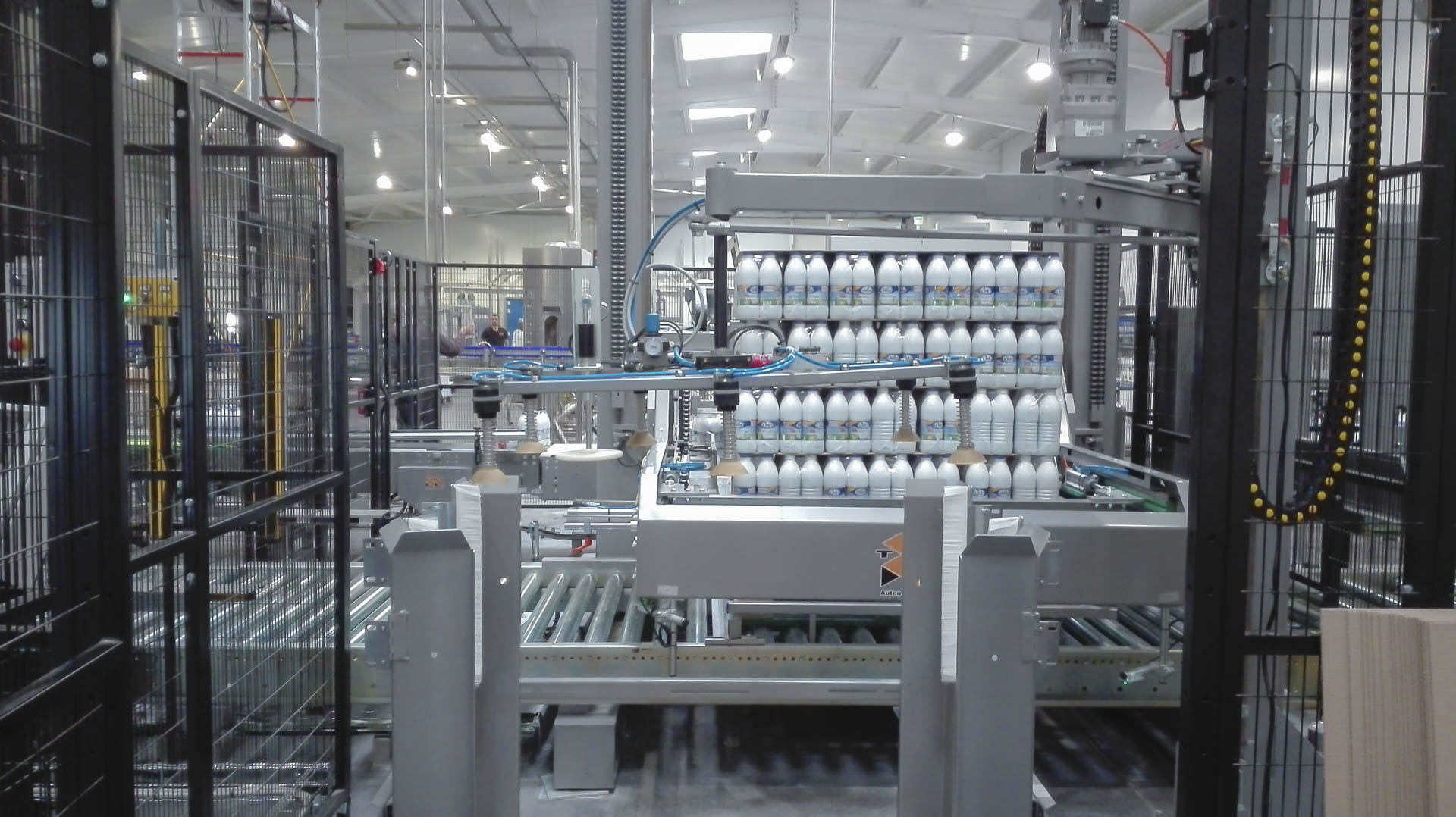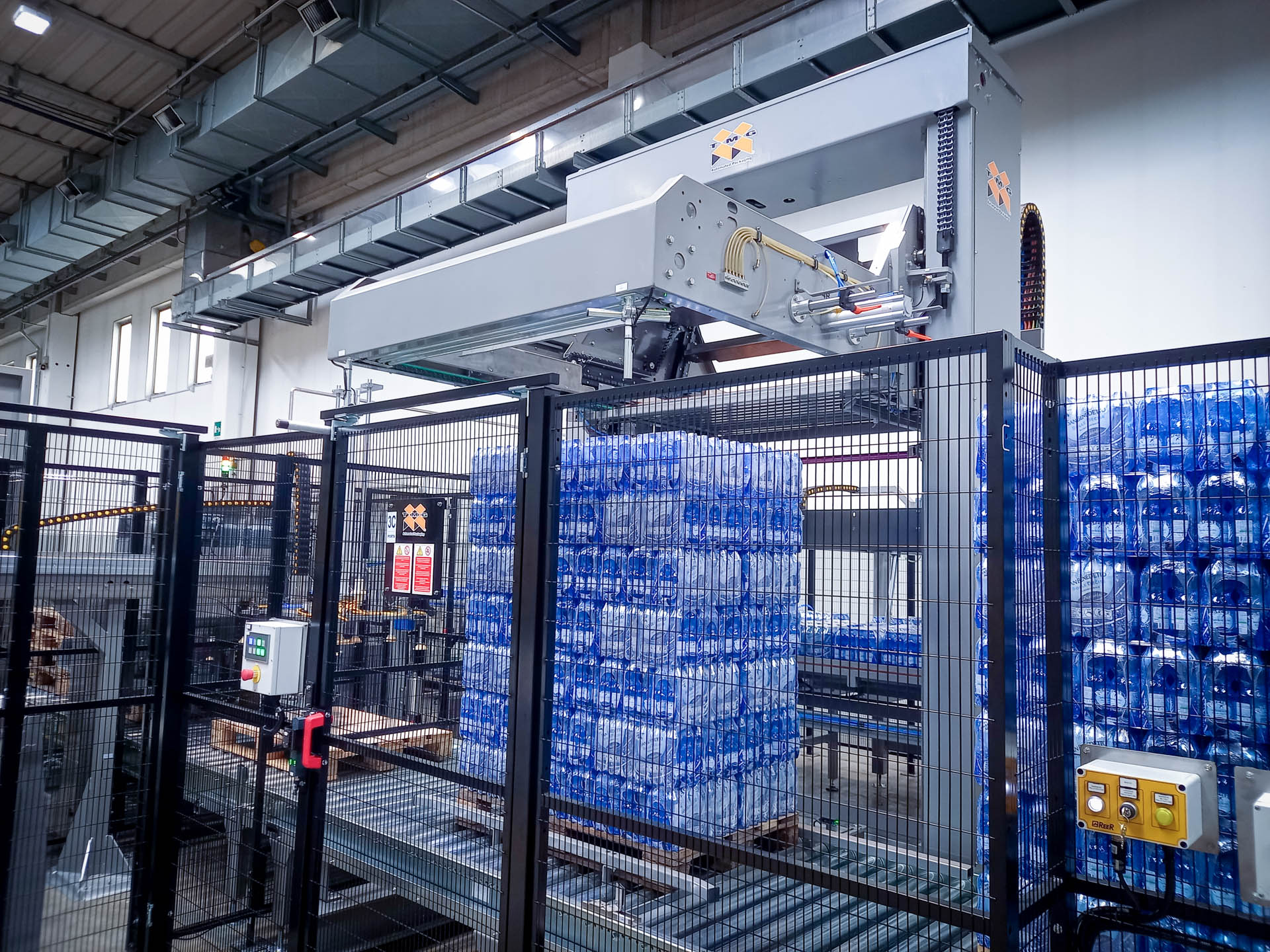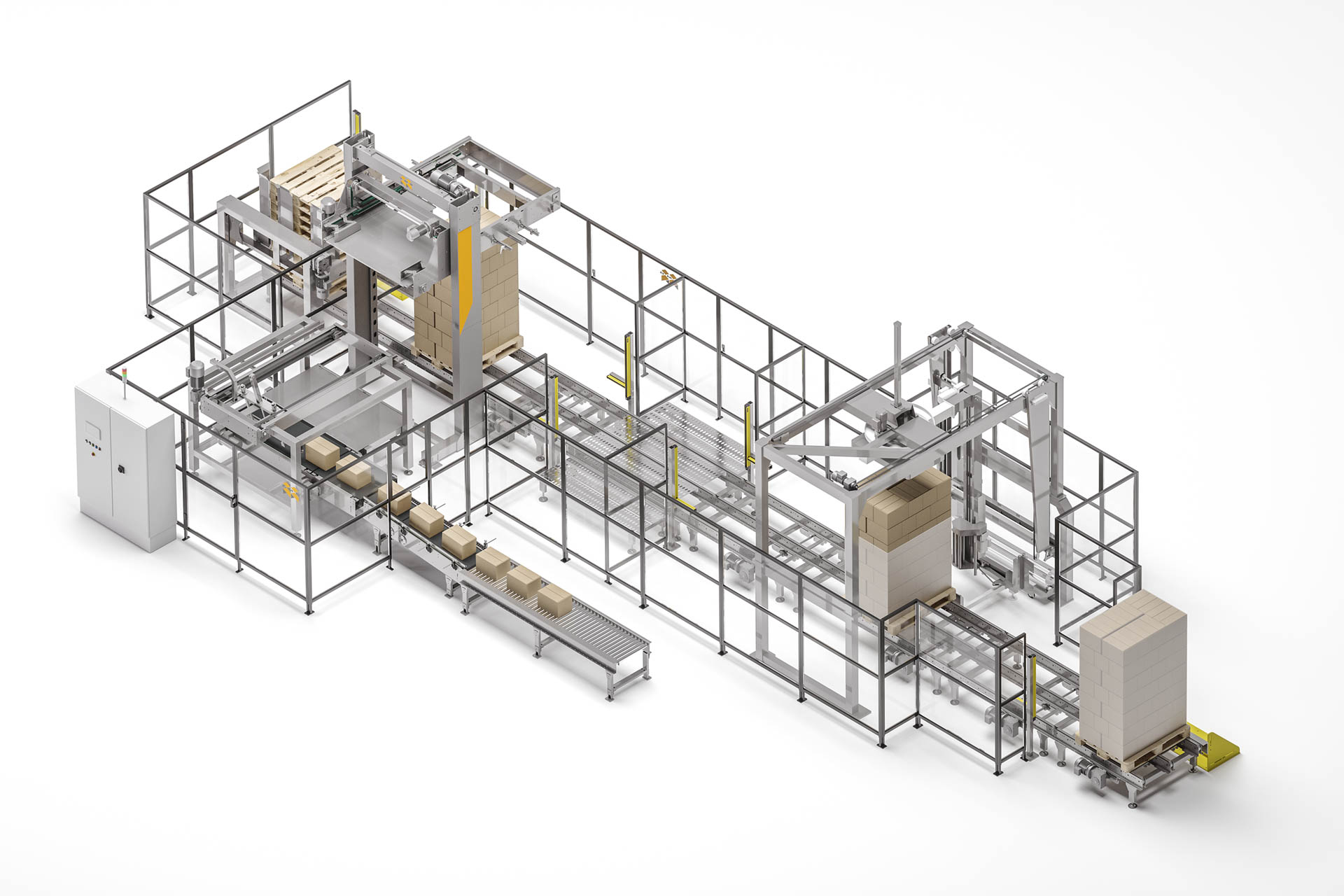 Low-level automatic palletiser with the pallet in a stationery position for medium production needs. Ideal for cartons, crates, jerry cans and shrinkpacked products. The products on infeed are distanced one from the other, orientated, grouped into layers and placed on the pallet in a pre-determined programme. It is possible to insert layers of different material between each layer.
